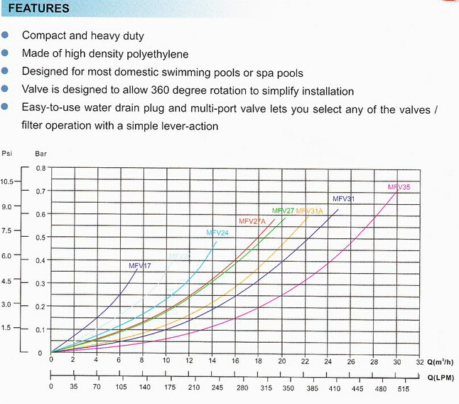 *Easy-to-use water drain plug and multi-port valve lets you select any of the valves/ filter operation with a simple lever-action